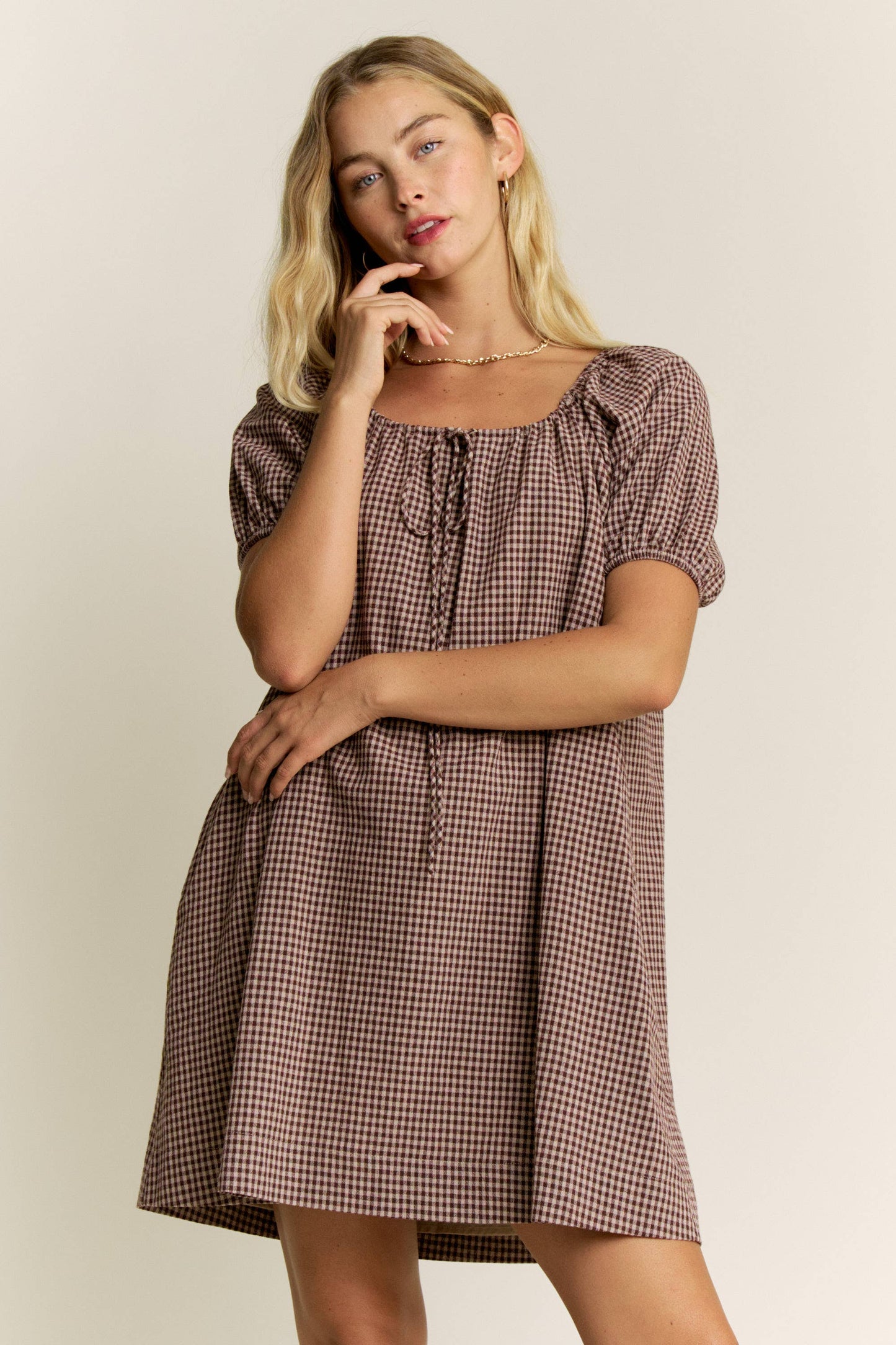 Georgia Gingham Puff Sleeve Dress in Mocha